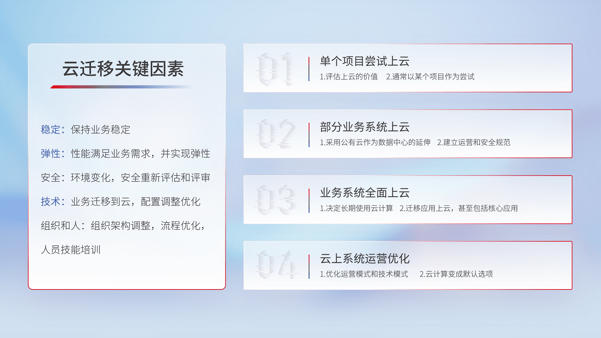 结合实际业务,,,,从规划设计、、、云平台选型、、、云原生改造、、、、数据迁移、、、、集成交付,,,,迁移全过程为客户识别最佳上云路径,,做好风险识别管理,,,,设计网络架构、、、身份权限、、安全审计合规、、操作审计、、、、日志审计、、、监控告警策略、、、多站点容灾设计等,,,,对云上基础设施进行整体规划,,,,提升IT治理水平,,,以满足弹性、、高可用、、、、高性能的需求。。。