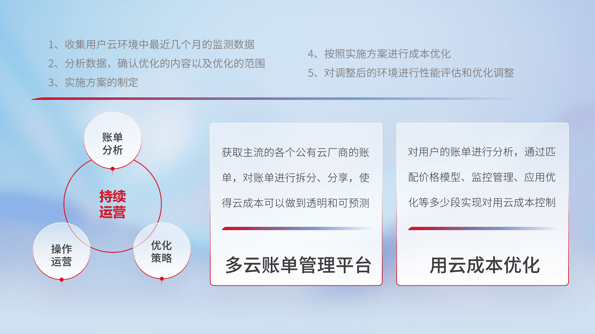 通过多云纳管,,,以统一的资源数据模型把客户的云资源进行抽象和封装,,,,进而实现对多云资源的统一操作,,保障云资源管理的可靠性、、、稳定性与可用性。。。量身定制化运维内容,,,配置、、开发运维、、补丁管理、、、、备份、、、监控、、、认证和访问管理、、、审计和日常巡检等,,保障在用云过程中的可靠度,,稳定度以及高可用率。。。。